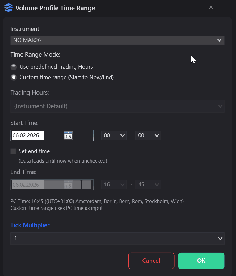 Define custom time ranges for volume profile analysis. Use predefined trading hours or set precise start and end times to focus on the sessions that matter most.